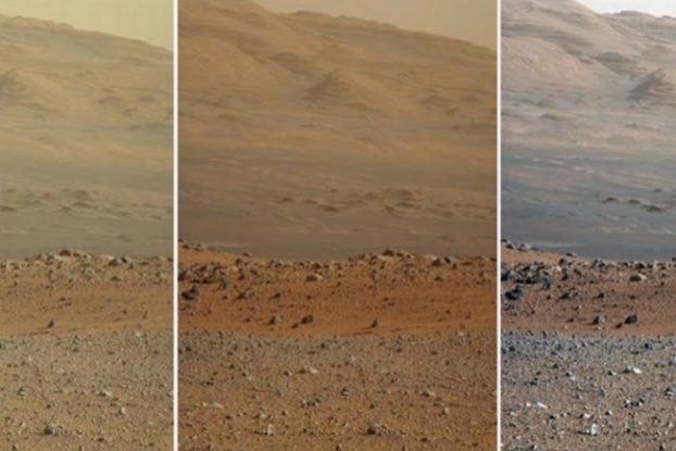 Na obrazku jest to samo zdjęcie z powierzchni Marsa wykonane aparatem zamontowanym na amerykańskim łaziku Curiosity. Z lewej obraz przedstawia to, co schodzi z matrycy aparatu bez żadnej obróbki. Na środku jest obraz po podkręceniu w sposób, który naukowcy NASA uznali, że dałby kolor naturalny, taki jaki byśmy widzieli. To jest obiegowa wersja kolorystyczna znana z mediów. Po prawej jest obraz ze zbalansowaną bielą. Na tym konkretnie zdjęciu tego nie widać aż tak dobrze, ale inne zdjęcia Marsa z NASA z balansem bieli wyglądają jakby były zrobione na Ziemi. Niebo na nich jest jasnoniebieskie i wygląda bardzo naturalnie, znajomo.